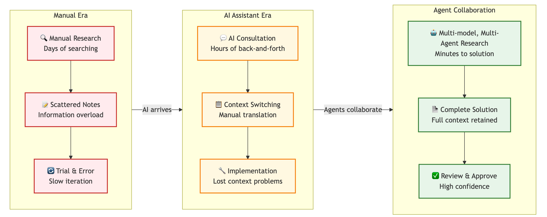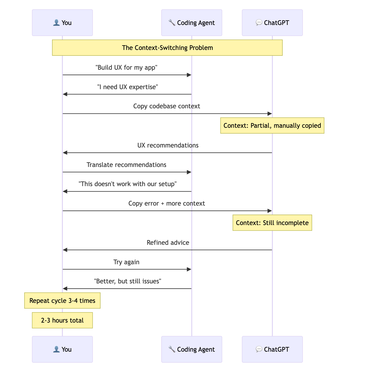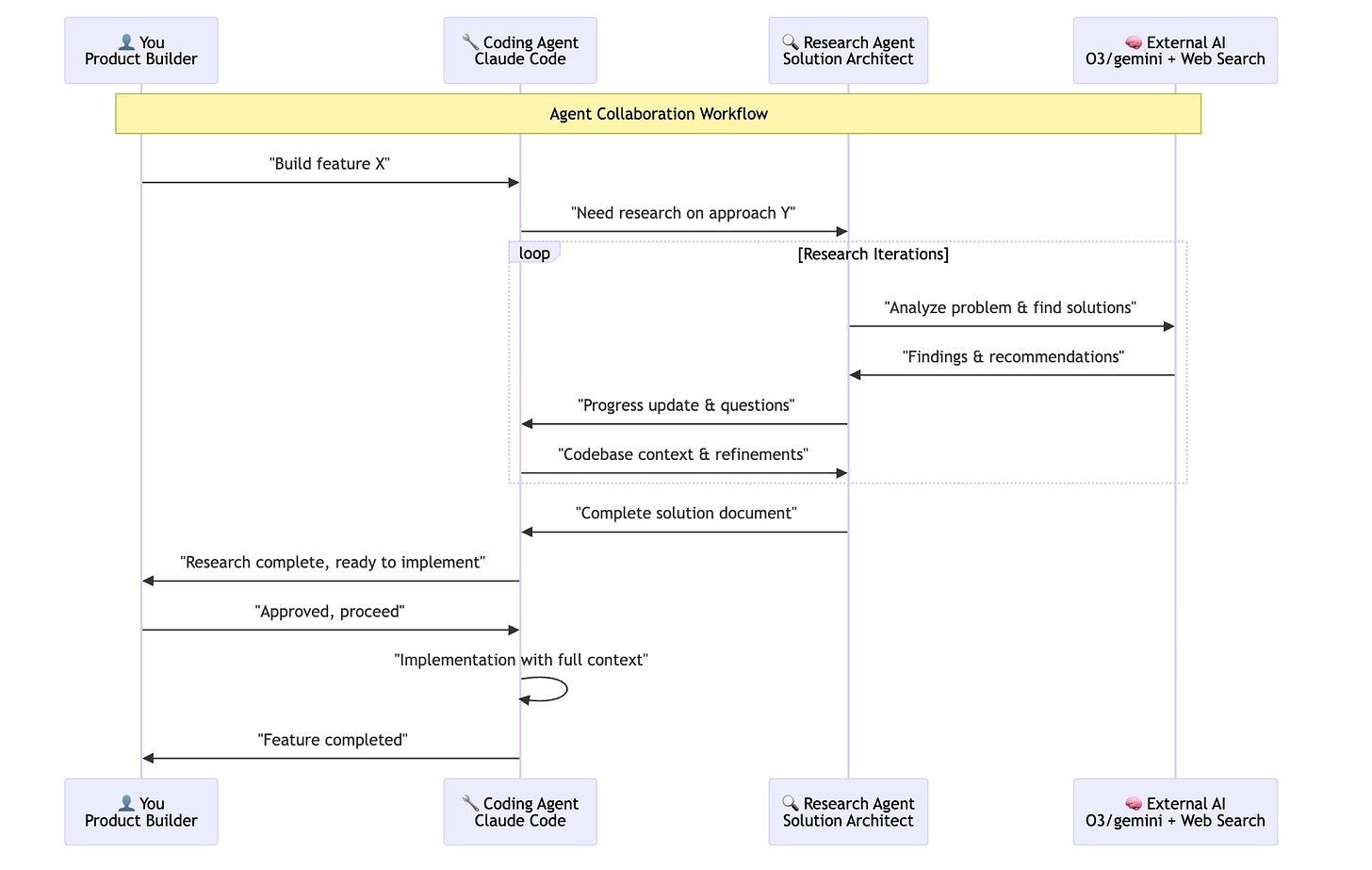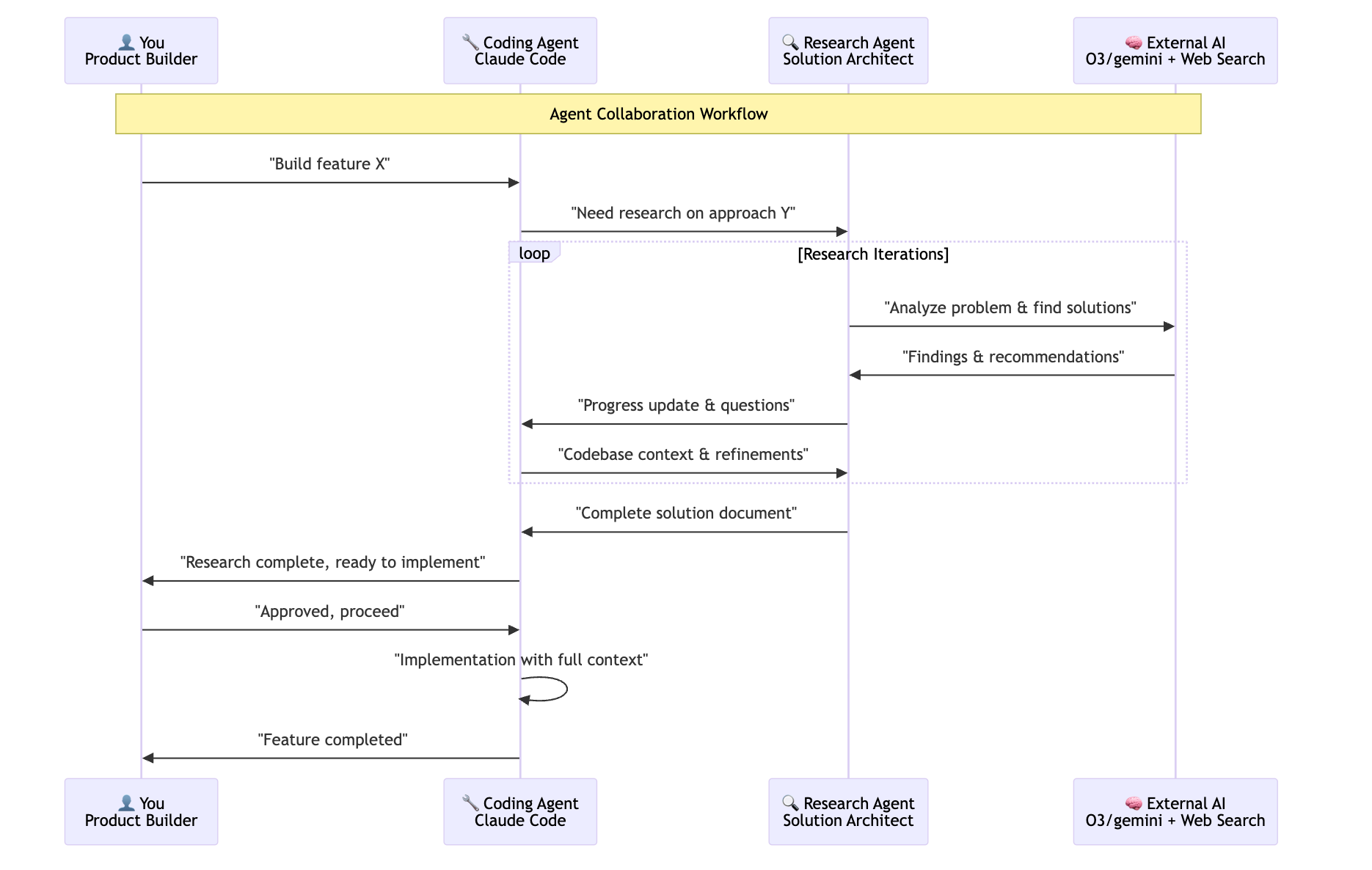 The context-switching problem became unbearable. I was spending too much time being a translator between my coding agent and research AI, losing important details in the process. I thought: "Why can't my coding agent just talk directly to the research experts?"