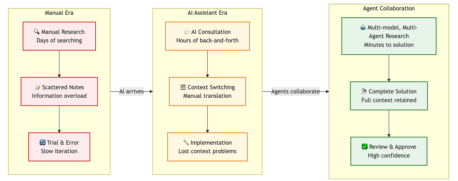 Focus shift to verification and decision-making: I'm not spending time gathering data anymore. Instead, I'm evaluating trade-offs, making strategic decisions, writing tests, and shipping features. The agents handle the time-consuming research work while I maintain decision-making control.